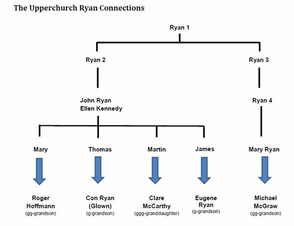 Upperchurch Ryan Connections - IntroductionThe chart below summarizes the connections of five individuals to common ancestors. My connection to Ryan 1 was originally discovered by Con Ryan of Glown and his late cousin Michael Quinlan in the Upperchurch parish records back in 2000. Between 2010 and 2015 Roger Hoffmann and I had exchanged information in an unsuccessful attempt to find a connection between our Ryan ancestors who had both come from the Upperchurch area and both had settled in Syracuse, NY. By early 2017 I had transcribed baptism records from the parishes around Upperchurch from the parish registers and reformatted that information into family trees. These trees were posted on my website (http://mcgrathsearch.com) under the “Families in Ireland” web page. It was hoped that this would facilitate others in finding their own connections to the Upperchurch area. In the “Family Connections” section under “Families in Ireland” there are links to documents that describe the status of several of these efforts.