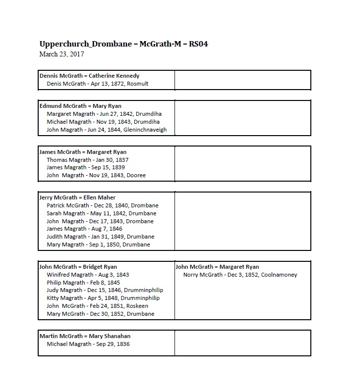 The civil registration of Catholic births, marriages and deaths were required beginning in 1864. These records through about 1920 are available on line at https://irishgenealogy.ie The birth and marriage records of the McGrath and Long families in the Thurles and Cashel registration districts were extracted from the civil records. The results are presented in a series of four papers: McGrath in Thurles and Cashel; Long in Thurles and Cashel. Each paper has its own table of contents so that it’s possible to easily navigate these data intense papers. The primary areas of interest are the civil parishes of Upperchurch, Moyaliff and Holycross but it was decided to use a larger net and to transcribe all the McGrath and Long birth and marriage records in both of the above registration districts. |