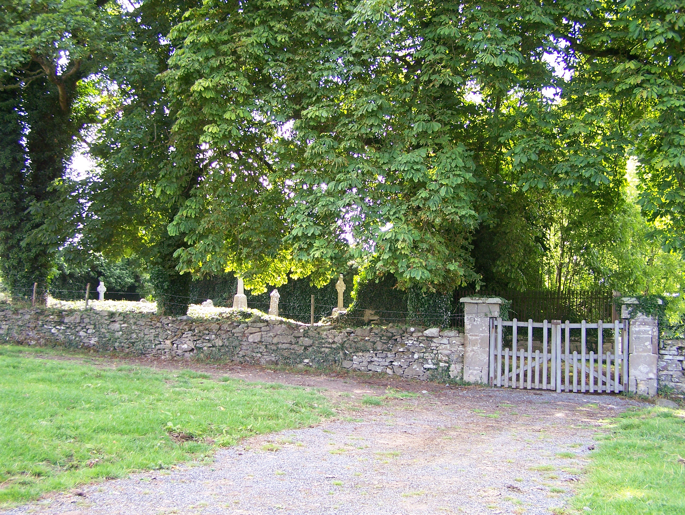 This was going to be “Cemetery Day” and our first stop was Moyaliffe Cemetery. The ruins of Moyaliff Church were shown on the Discovery Series, Ordnance Survey map. A previous attempt at visiting this cemetery, by relatives, some years ago, had met with failure due to the time of year and the muddy conditions of the field. A while back I had tripped over an Irish building permit filing on the Internet for the construction of an improved access road to the cemetery. So, I was hoping that the project had been approved and completed. Luck was with us – the Moyaliff Cemetery now had a stone driveway that led all the way up to the cemetery. The plaque at the entrance of the cemetery indicated that the improved road had just opened in Dec 2005.