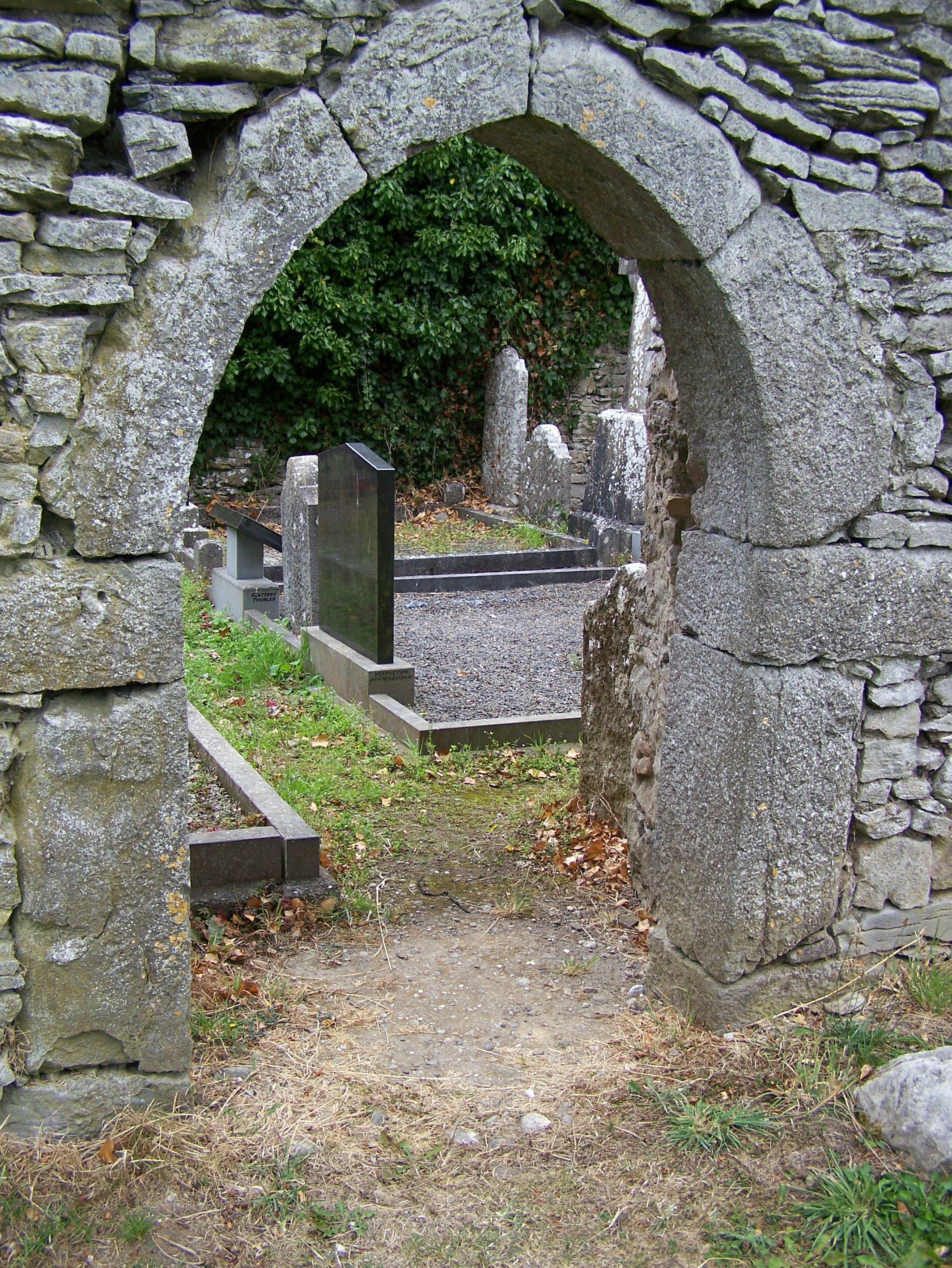 Turning around – which wasn’t easy on those narrow roads- we went back to the turn off. This was indeed the Templemichael (Templebeg) Cemetery and so we went a little further up this narrow road looking for a place to park or at least a place to pull over. Near the end of the road there was a new modern house being built – there seemed to be large, expensive houses going up everywhere we went in Ireland. We turned around and came back down the road and stopped in front of the cemetery entrance. It was obvious we couldn’t drive any closer to the cemetery and the only place available to leave the car was the small entrance to the cemetery itself. I pulled the car over to the left as far as I could into the small entrance to the cemetery but it was still half in the road. Good enough – and over the fields we went - always looking down because these were cow pastures. Templebeg Cemetery was located across a cow pasture but was marked with a sign and was still an active cemetery. There were the ruins of an ancient chapel in this cemetery also – the third one today. And as was the case in the others, there were graves both inside and outside the crumbling walls of the ruins. We shot a few pictures and quickly checked out the inscriptions on the stones for familiar names. There weren’t any Magrath graves that we could locate even though the Nenagh Heritage group had one or more on their list.