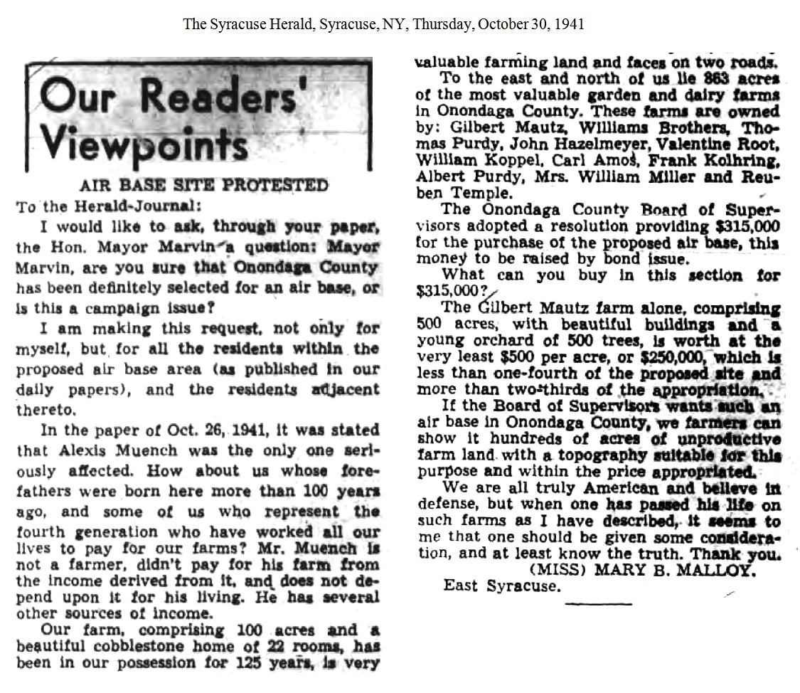 James Molloy continued farming until his death due to a heart attack in 1936. His wife Elizabeth had died in 1928. The U.S. Government purchased the Molloy farm, in early 1942, along with a couple dozen other farms, in the Towns of Salina, DeWitt and Cicero, for the construction of the Army Air Base. As a result, Kathie and Mary Molloy were forced to move. After the war the government offer the Molloy house for sale but their were no takers. On July 25, 1954 four barns and the cobblestone house were destroyed by fire.