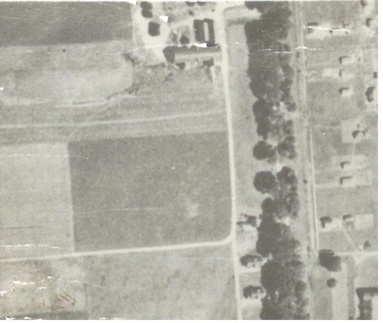 Along the top of this 1926 aerial photo is seen the southern portion of John Kirsch's farm, along the west side of Brewerton Road. Prominently shown is the large 100' by 40' barn that was built in 1923 for $20,000. At midnight on the evening of Sunday, July 31, 1927 the barn was destroyed by a suspicious fire [1927-08-01]. In the lower right hand corner of this picture a portion of Frank Matty's double barn can be seen. Over the years it was host to many political, school and social functions. Until they had a building of their own the Mattydale Volunteer Fire Department occupied the northern half of the large barn.