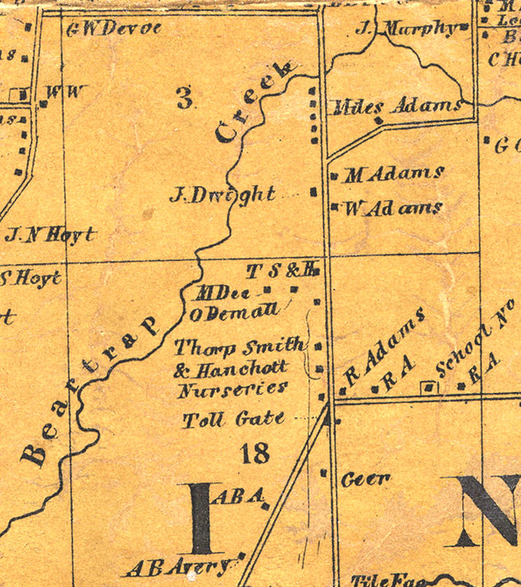 This map above is from 1792-3, it is from the first page of DeWitt’s maps. Lot 18 is labeled and Lot 3 is right above it, but is unlabeled. Bear Trap Creek can be seen to occupy much of Lot 3. These lot numbers are still found in the legal descriptions of property in the Onondaga Country deed books.