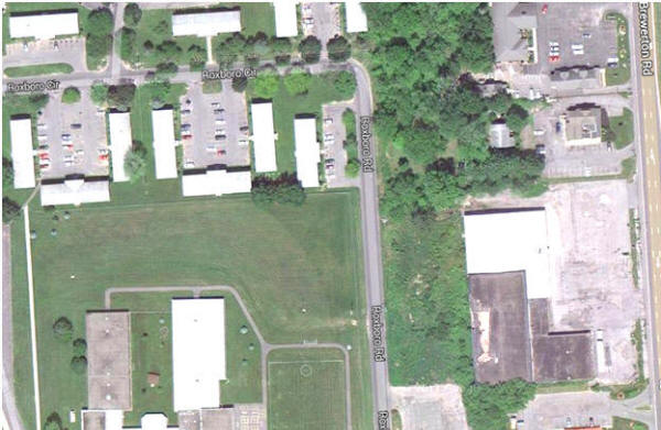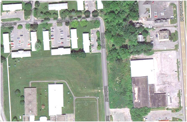 2014 - On the left side of this aerial image are the Orchard Estate Apartments at the top and Roxboro Elementary School at the bottom. Roxboro Road runs north & south, up the middle of the image and the southbound lane of Brewerton Road can be seen along the right hand side (east) of the image. The building in the lower right hand corner is the Action Sport and Skate.