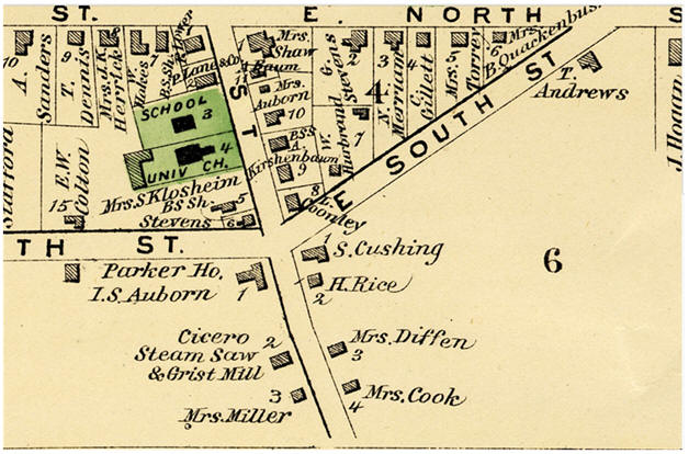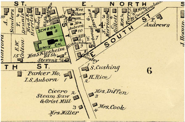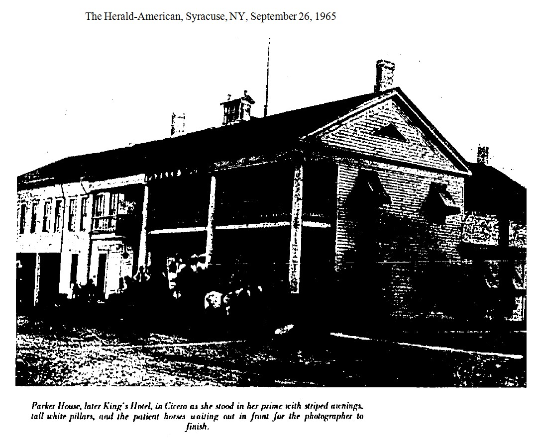 The Parker House was located south of Main St on the Plank Road in Village of Cicero. The structure began in 1818, located at what was then called Cody’s Corners. Jed Settle was running the Parker House in June 1871. The hotel was named after a local citizen named R. H. Parker. [1871-06-26]