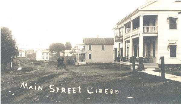 Date of picture – unknown. Location: Main Street in the village of Cicero, looking south. Shown above is an old picture of the Parker House that was located on Main Street, which was the Cicero Plank Road. There is also a story that the first part of the plank road was constructed in front of the Parker House. In this picture there doesn’t appear to be any plank road, it looks like a dirt road.