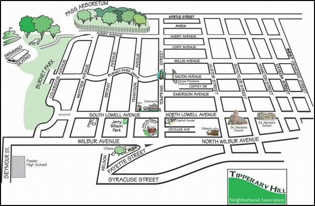 The boundaries of Tipperary Hill on the west side of Syracuse, NY today — according to the Tipperary Hill Neighborhood Association. This view is looking west, with north to the right. The Green Over the Red stop Light