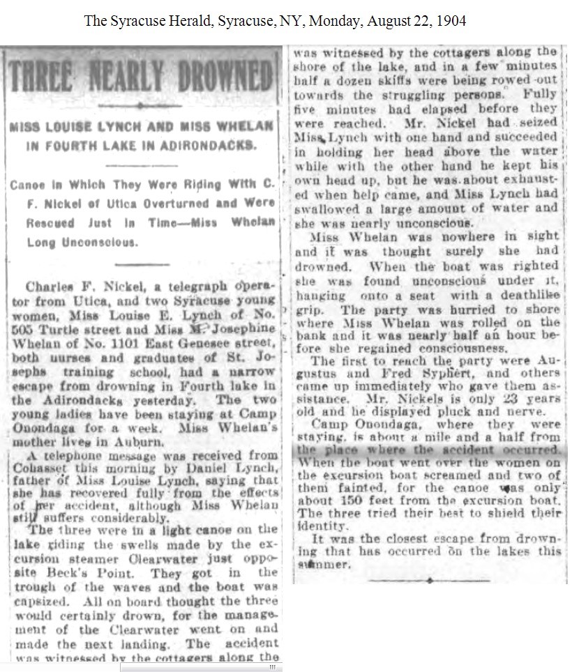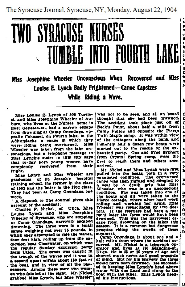 NOTES: [1904-08-22a] - "Two Syracuse Nurses Tumble Into Fourth Lake," The Syracuse Journal, Syracuse, NY, Monday, August 22, 1904.