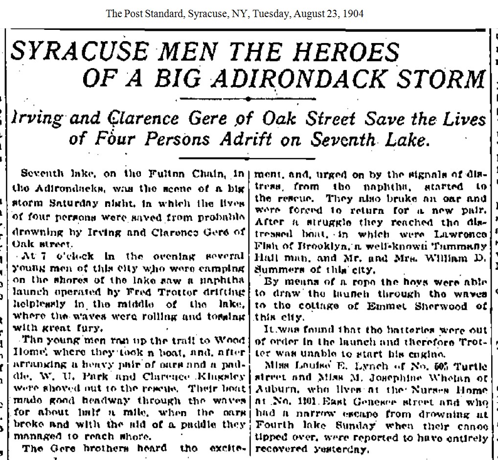 [1904-08-23] - "Syracuse Men The Heroes of a Big Adirondack Storm," The Post Standard, Syracuse, NY, Tuesday, August 23, 1904.