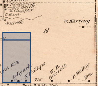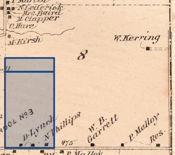 This map shows the two pieces of land, totaling 120 acres, that Daniel Lynch purchased on October 31, 1855, from Cyrel Carpenter and his wife, for $6600 |