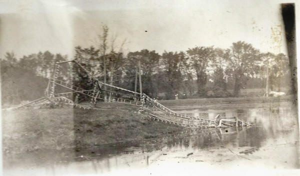 It has been determined that the house in the distance is the old Charles Bailey house in Pitcher. It was located on the northwest corner of the intersection of Bailey Road and the old Cicero Plank Road. At the time of the tornado the house was owned by a member of the Morey family. The road in the foreground is the Cicero Plank Road and the camera direction is approximately southwest. Another picture of this house, from the 1930s, taken from the south is found here.