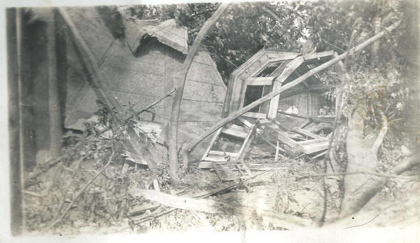 This house has been totally destroyed but amazingly the two trees next to the ruins don't appear to have sustained much damage. There is a road passing along in front of the house which can be seen in the lower right hand corner of the picture. Between the two trees there appears to be a cylindrical shaped mailbox that is still standing. This is possibly the Charles Chapman House |