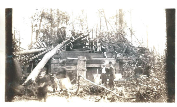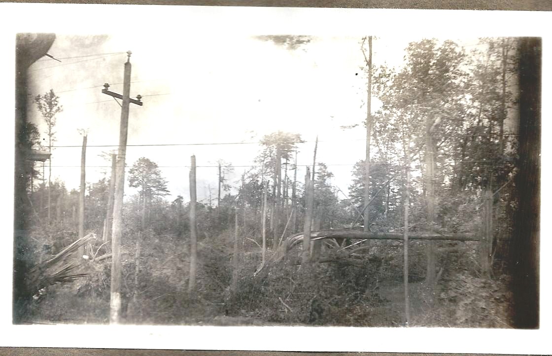 The house in the distance, in the center of this picture seems to have escaped unscathed. Along the right side of the road a couple dozen sawed trees trunks can be seen. The cleanup seems to be well underway at the time of this photo. Behind the main house is a smaller, open air structure that consisted of just a roof. The tornado must have passed out front, where al the trees were downed. This weak structure would have disappeared if the tornado had moved through the back end of the lot. |