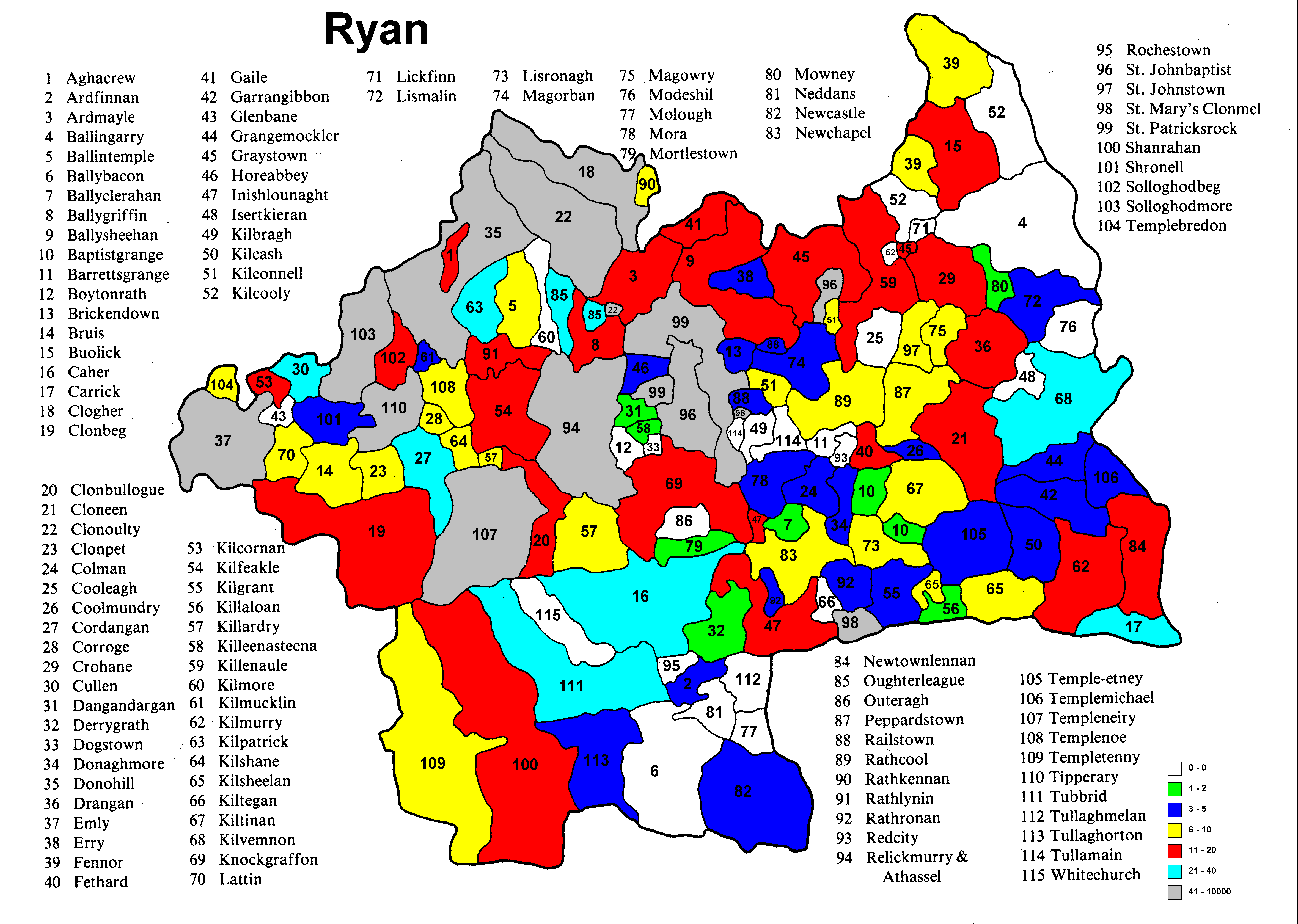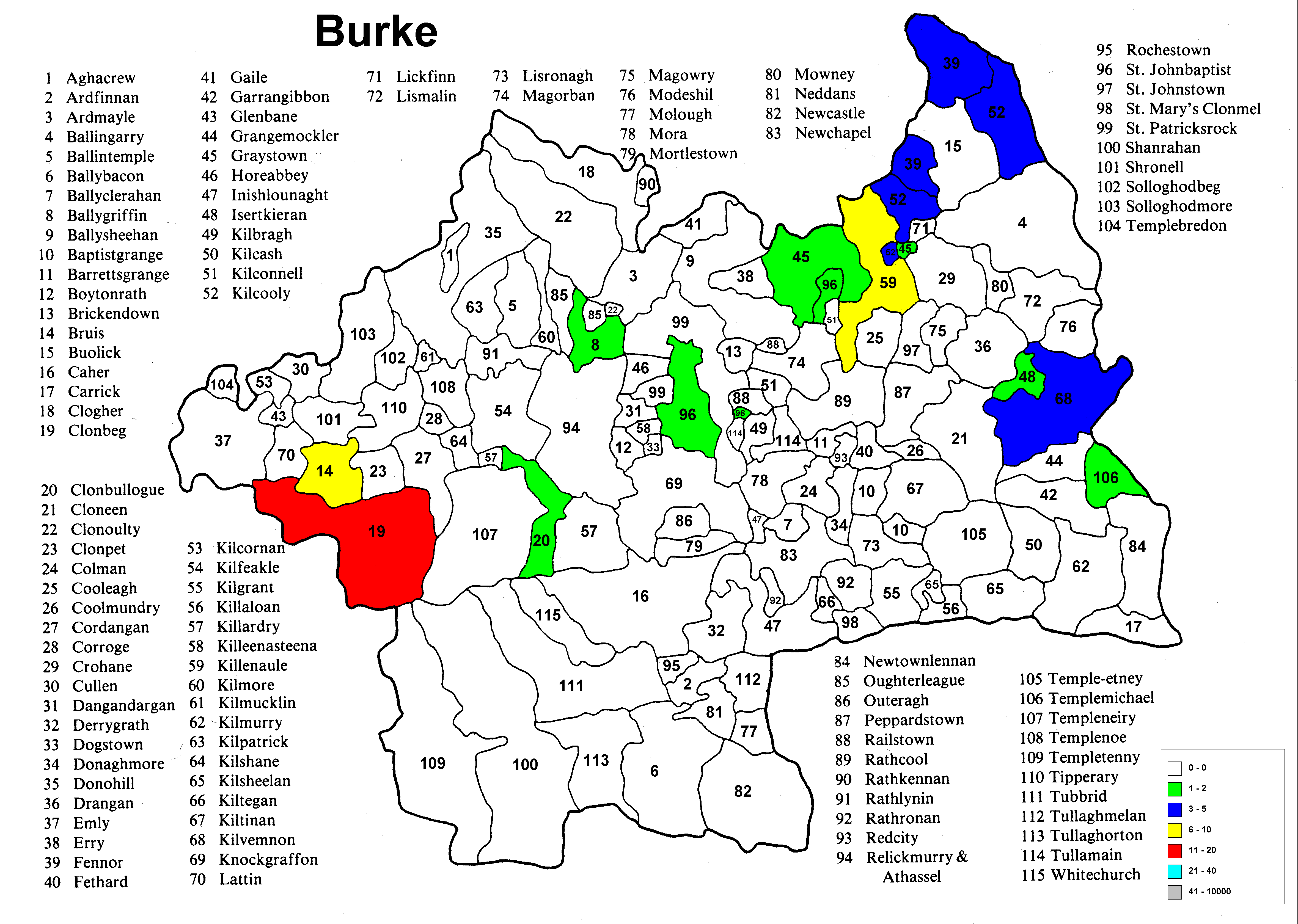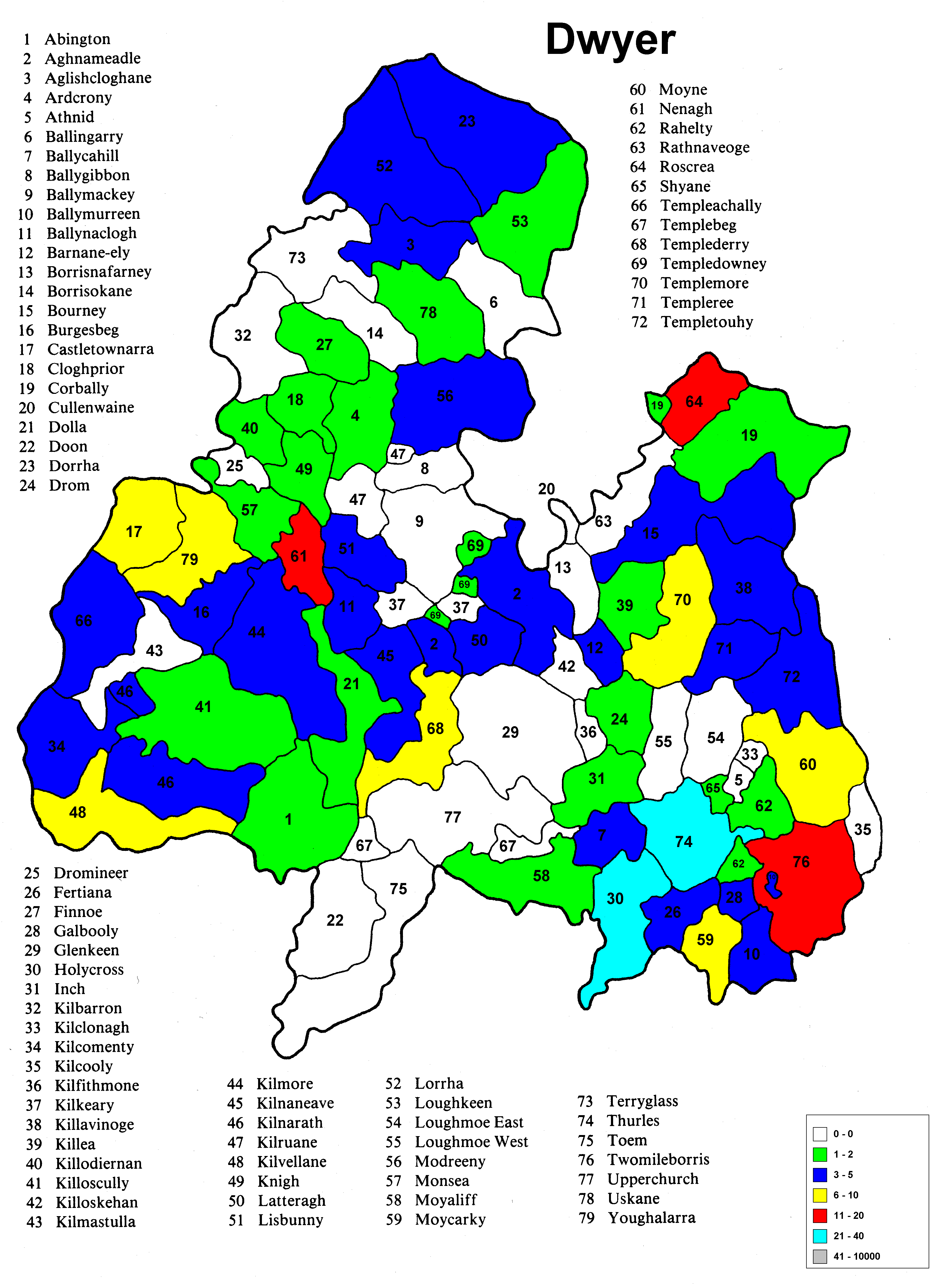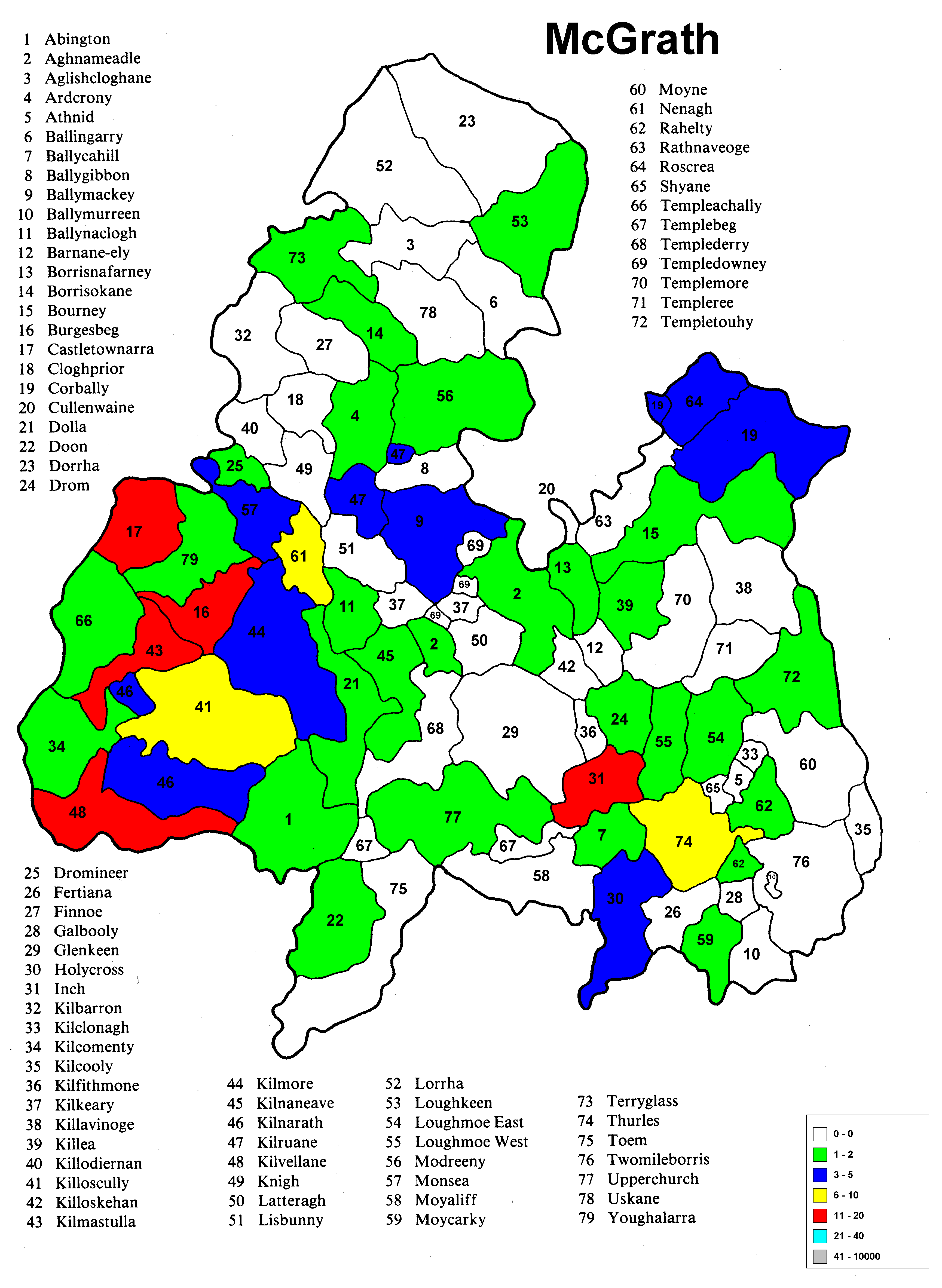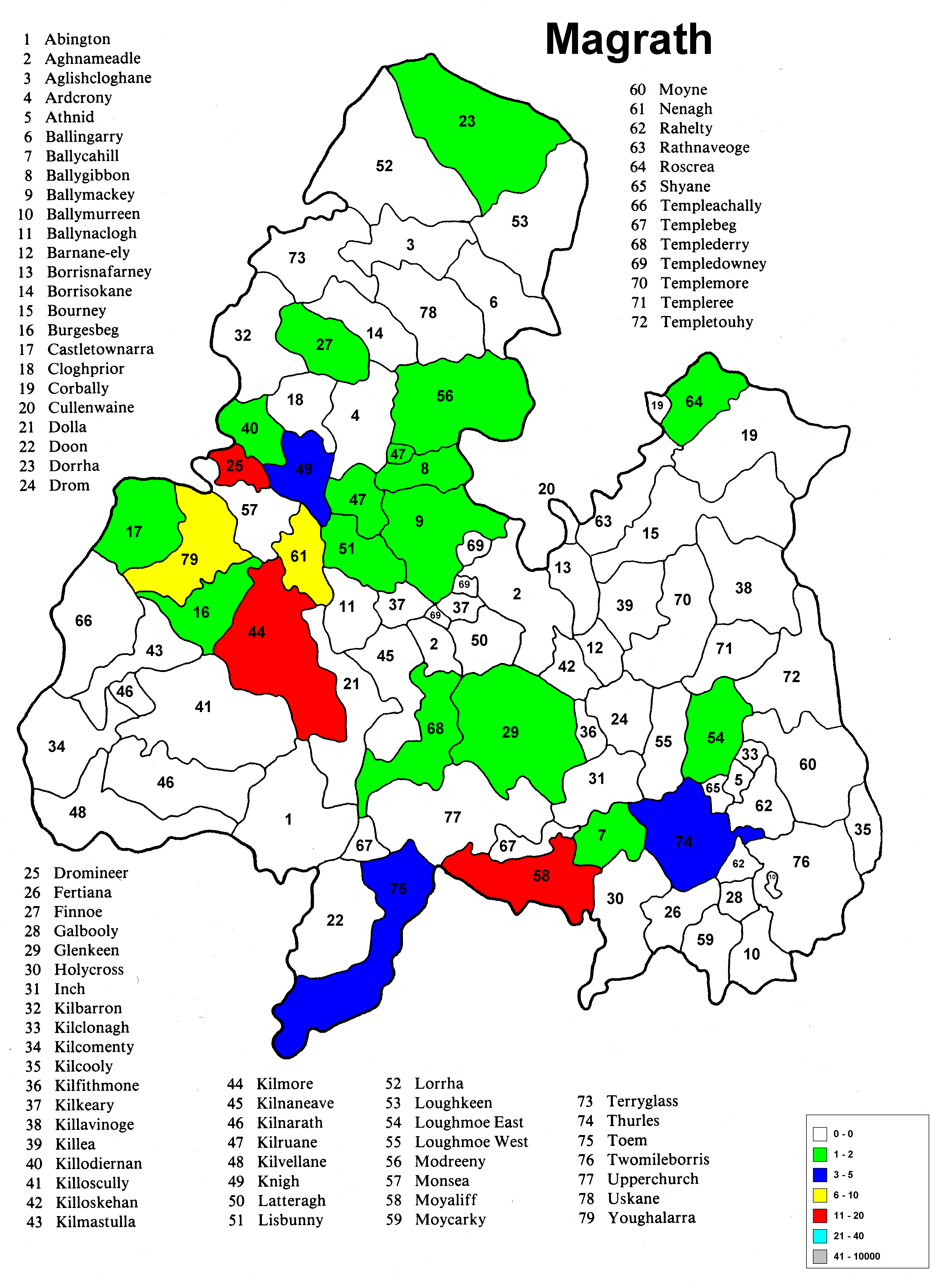 Irish geography presents special problems such as multipart counties (North & South Riding), multipart parishes (up to 5 in one county) and parish names that repeat in the different parts of the county. Everything has been sorted out except the multipart parishes in a given portion (Riding) of the county. The same count is applied to each portion because it wasn't possible to find a database that would allow the sorting of the townlands among the different parts of the parish