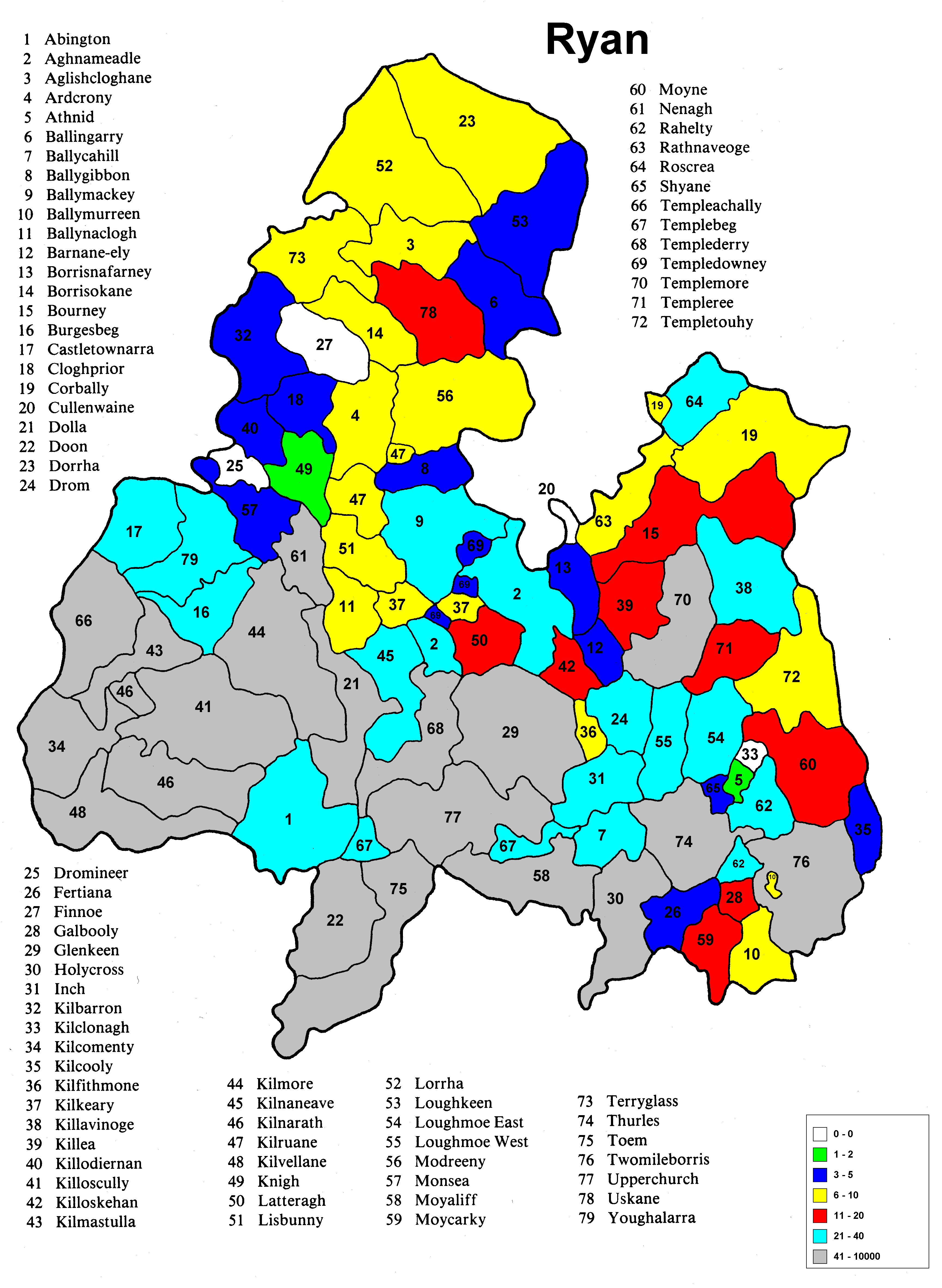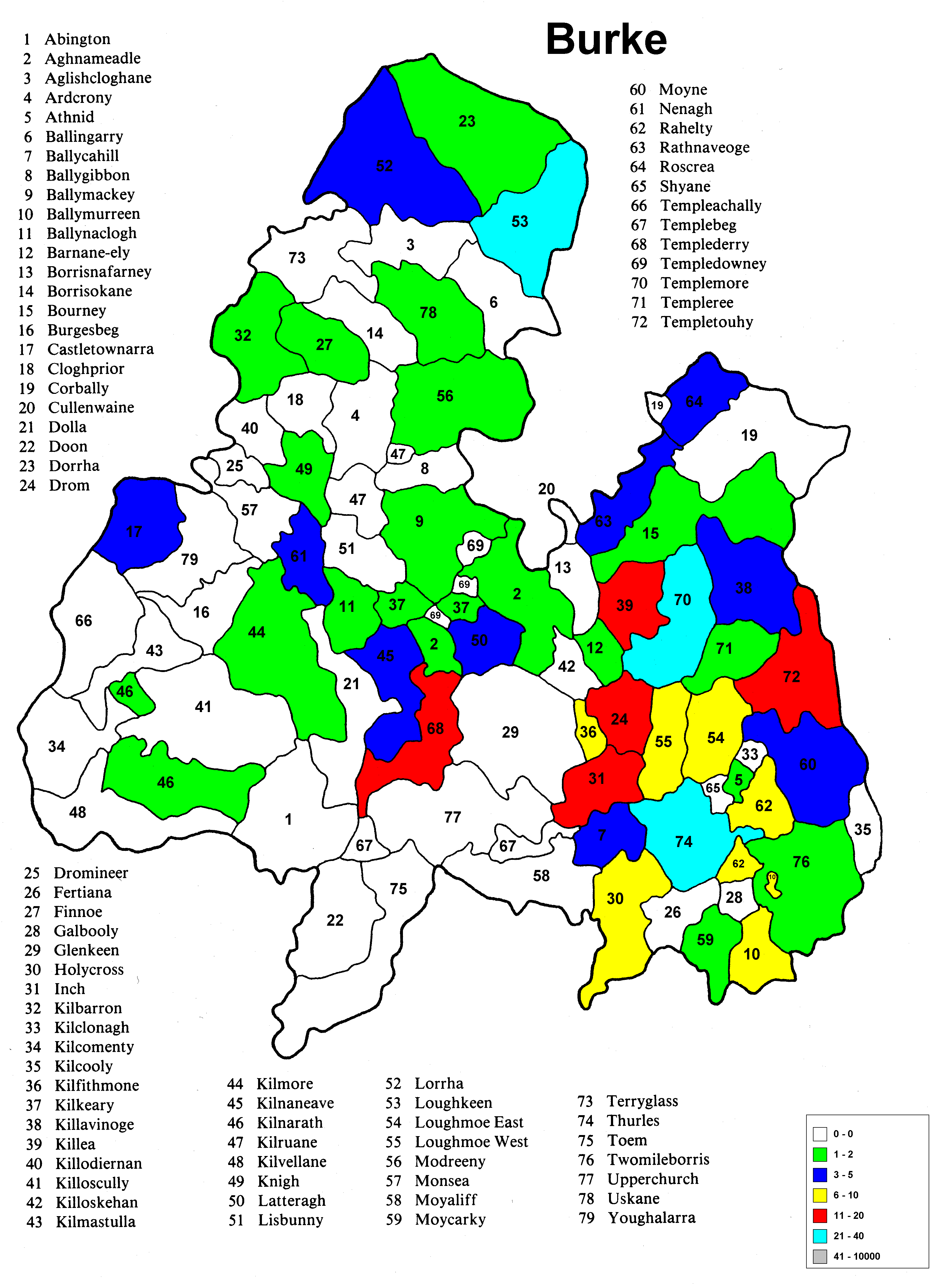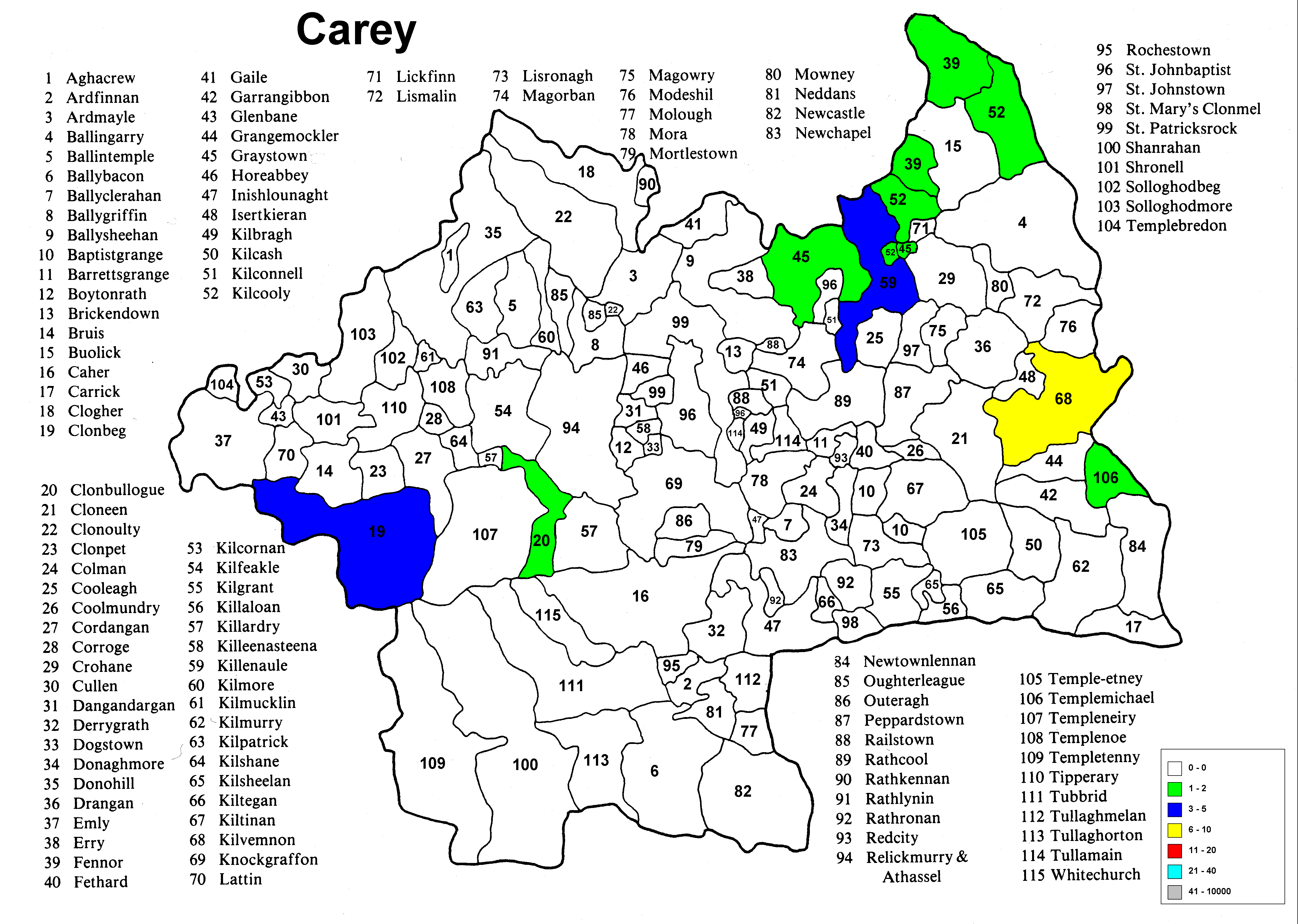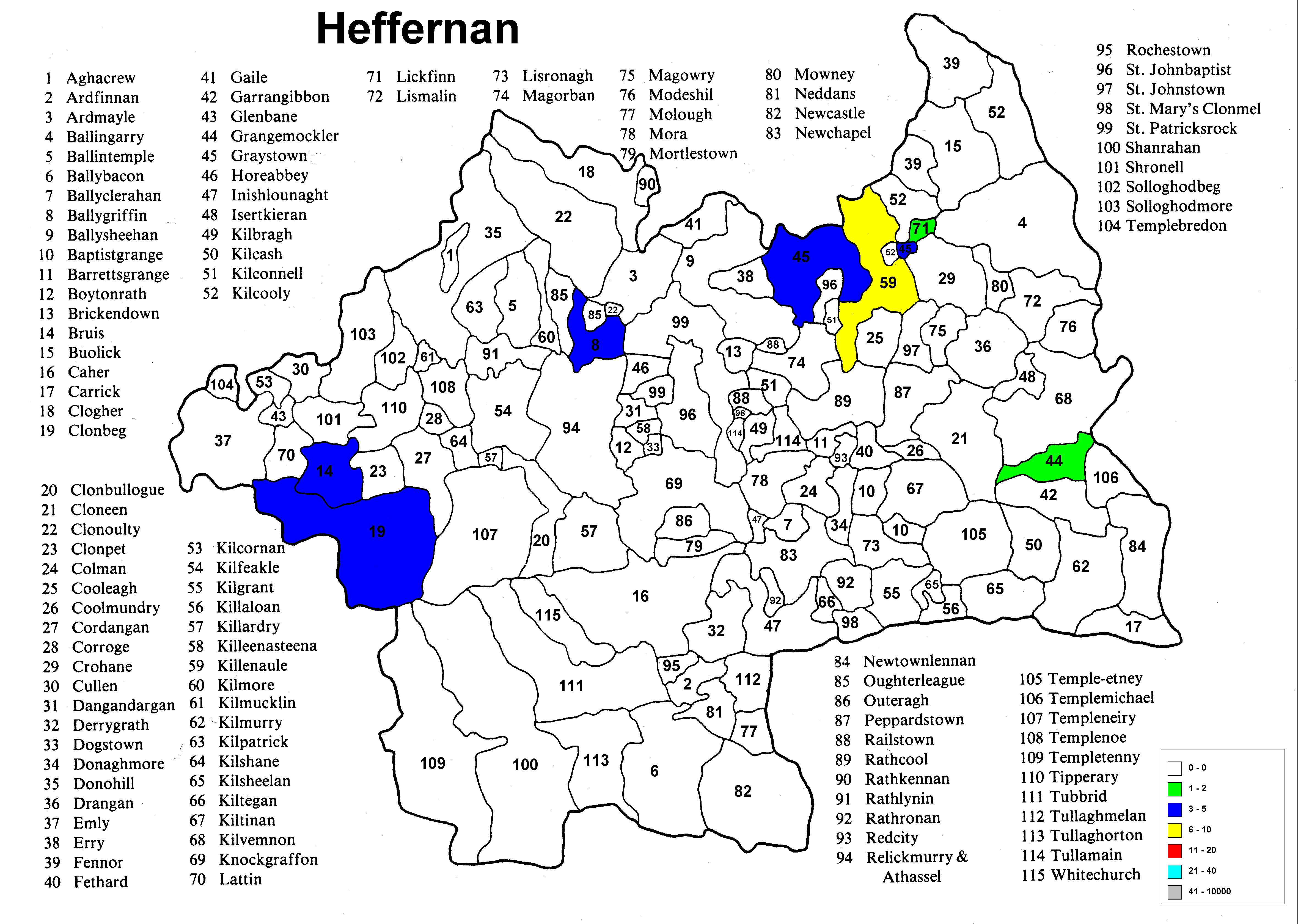 Irish geography presents special problems such as multipart counties (North & South Riding), multipart parishes (up to 5 in one county) and parish names that repeat in the different parts of the county. Everything has been sorted out except the multipart parishes in a given portion (Riding) of the county. The same count is applied to each portion because it wasn't possible to find a database that would allow the sorting of the townlands among the different parts of the parish