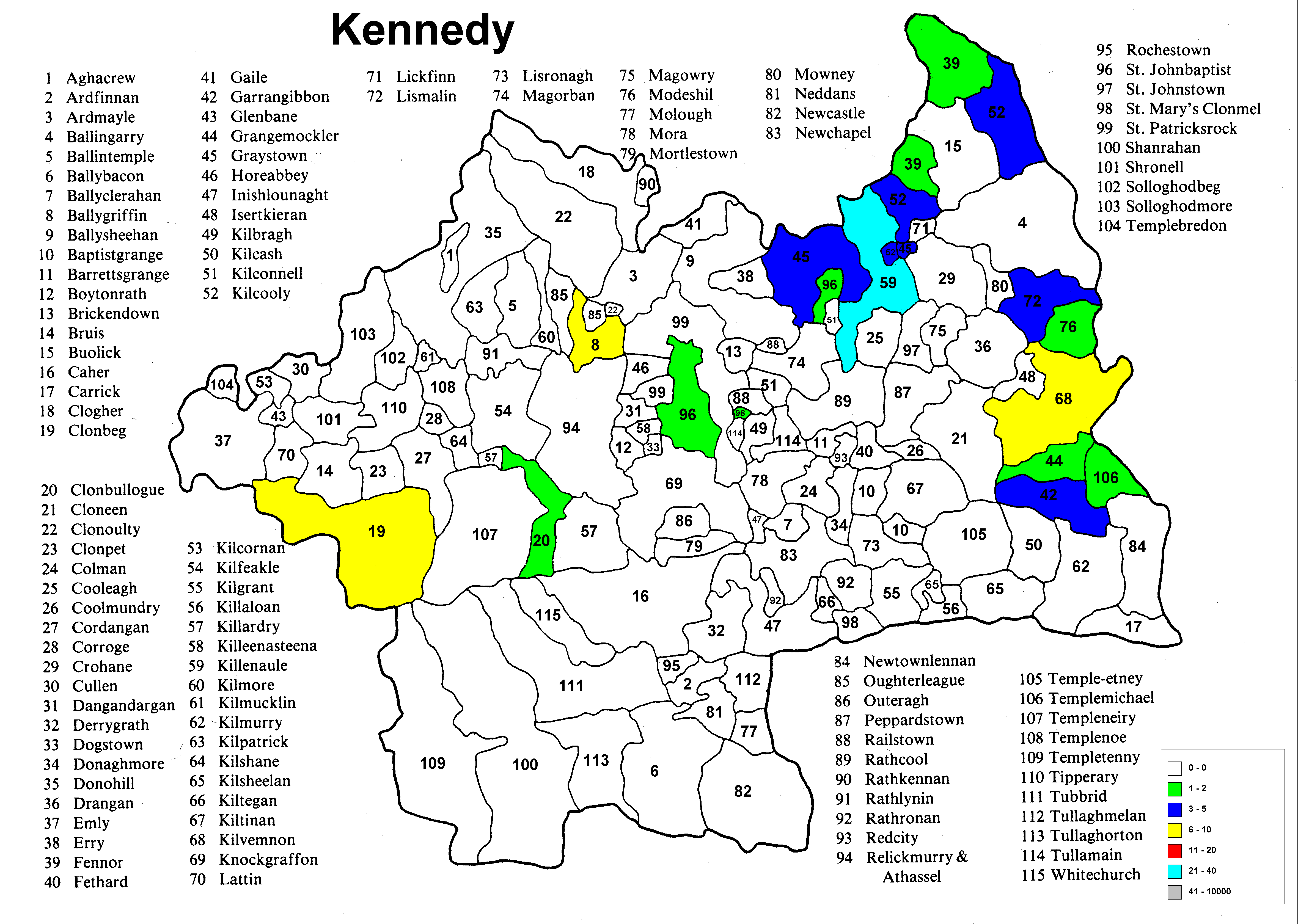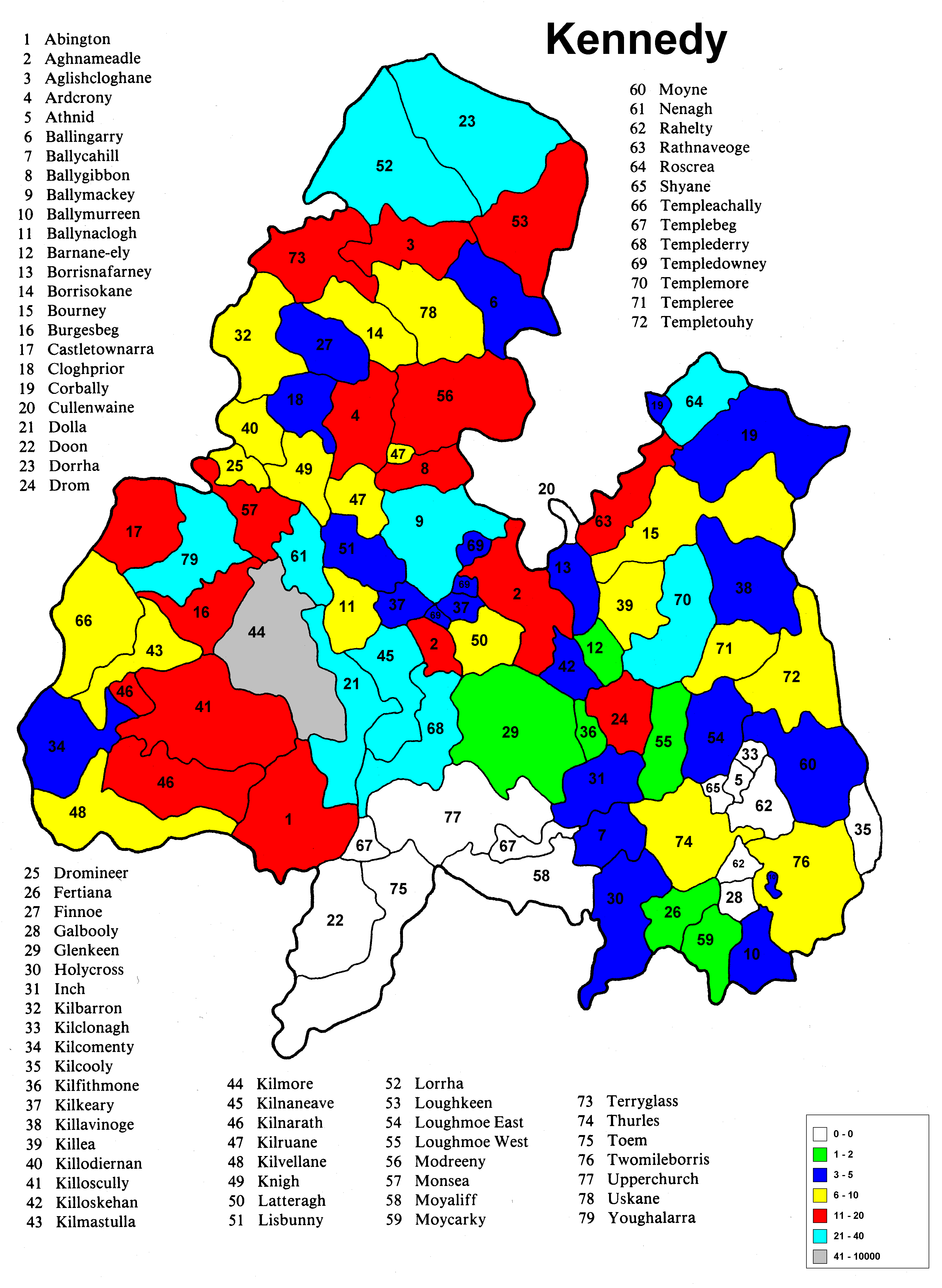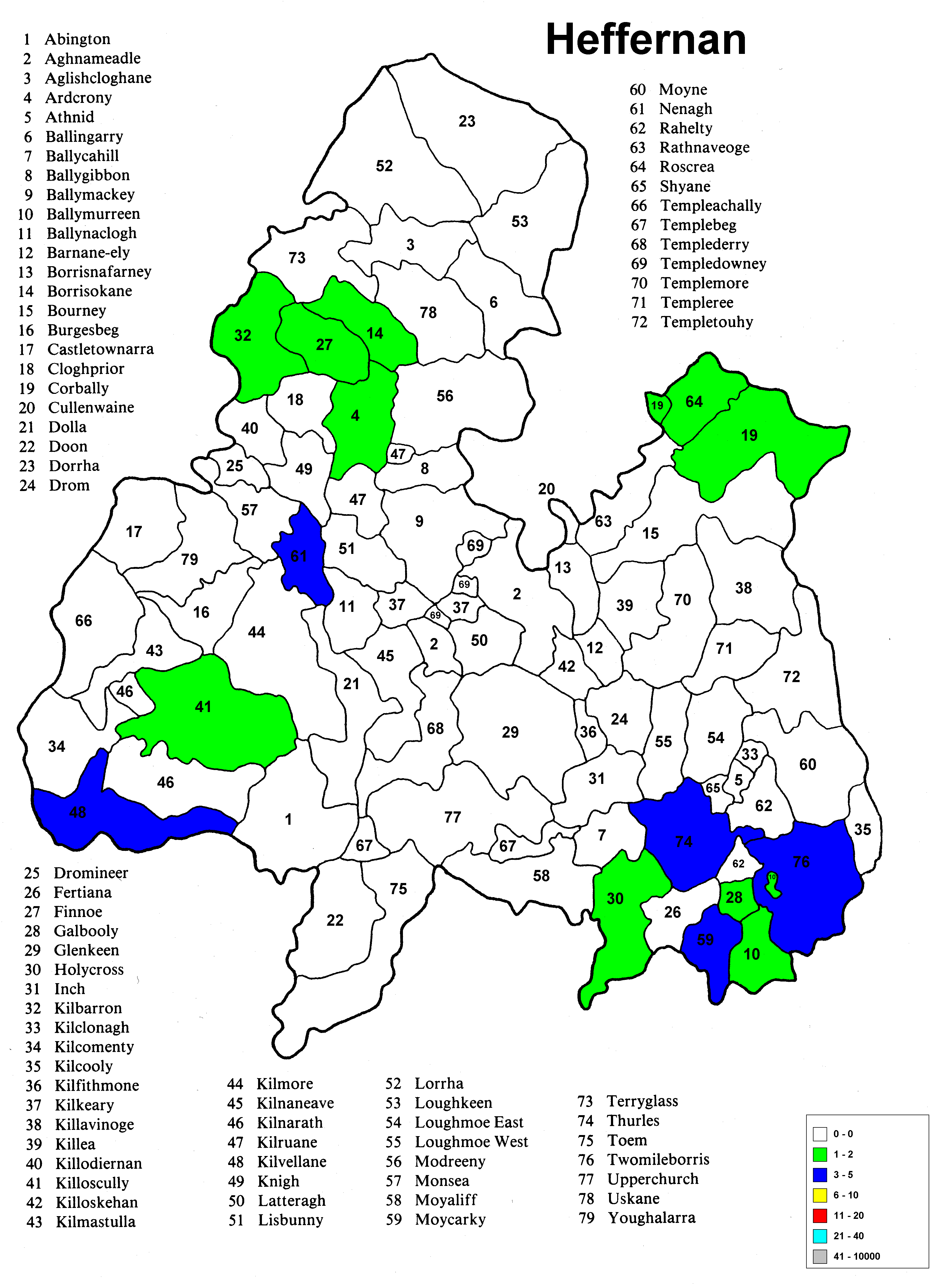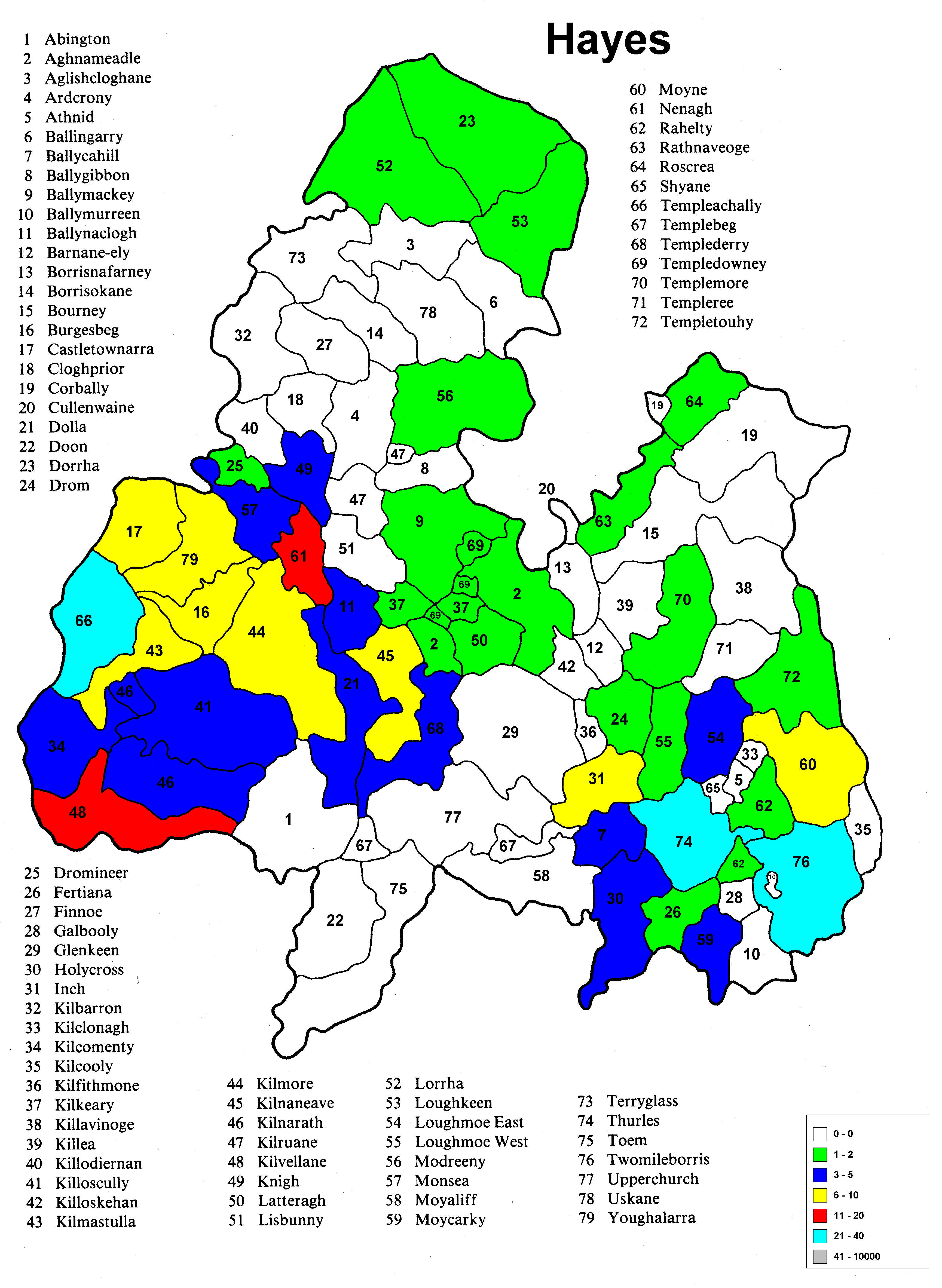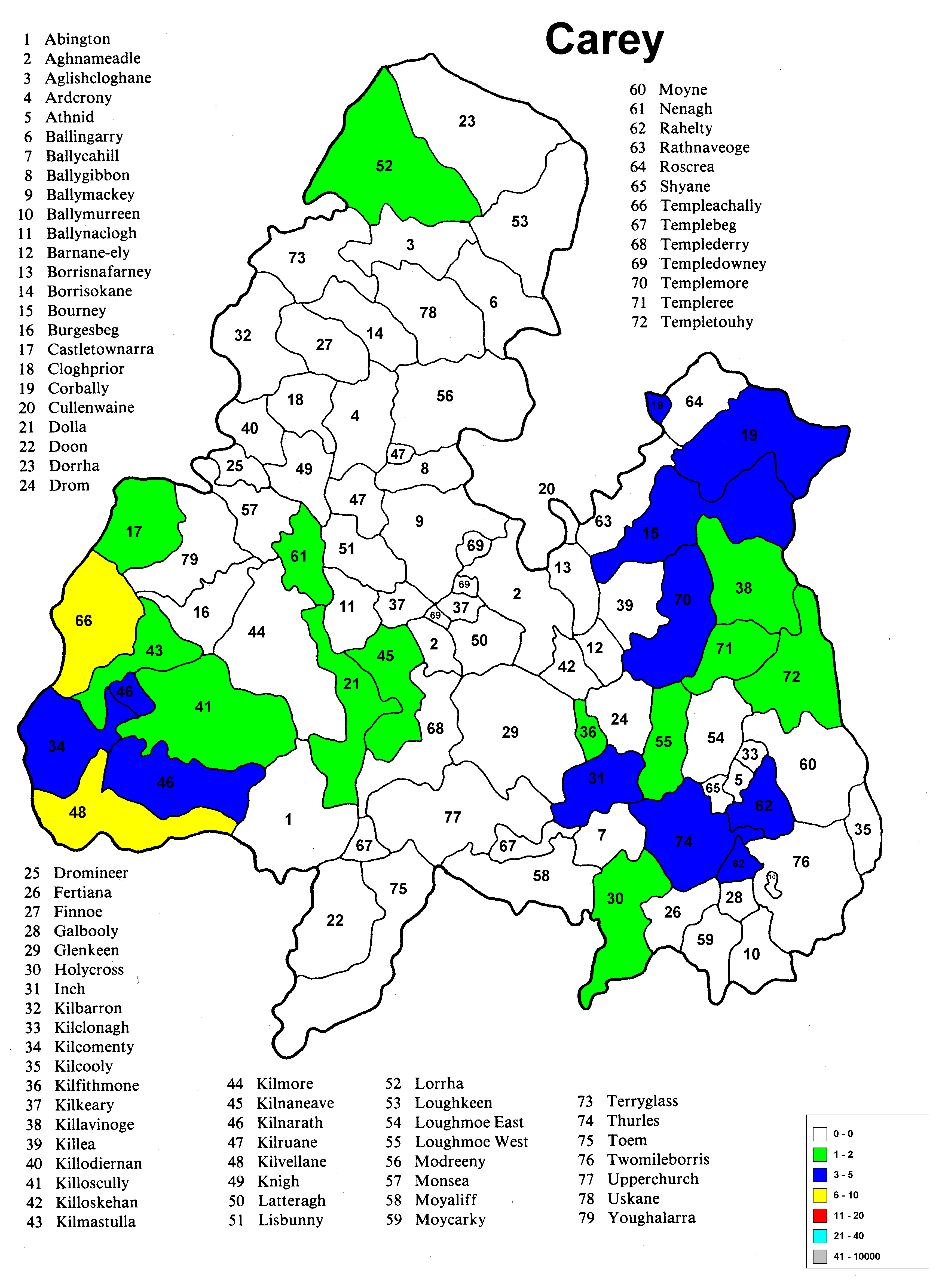 Irish geography presents special problems such as multipart counties (North & South Riding), multipart parishes (up to 5 in one county) and parish names that repeat in the different parts of the county. Everything has been sorted out except the multipart parishes in a given portion (Riding) of the county. The same count is applied to each portion because it wasn't possible to find a database that would allow the sorting of the townlands among the different parts of the parish