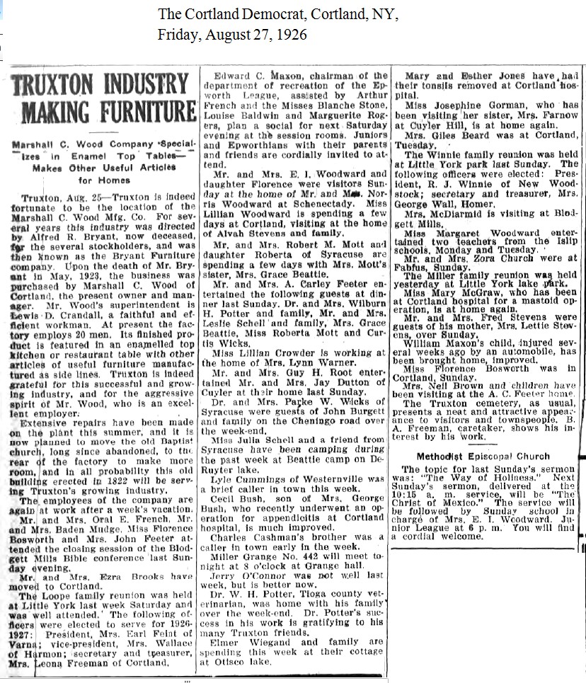 [1926-08-27] - “Truxton Industry Making Furniture,” The Cortland Democrat, Cortland, NY, Friday, August 27, 1926.
