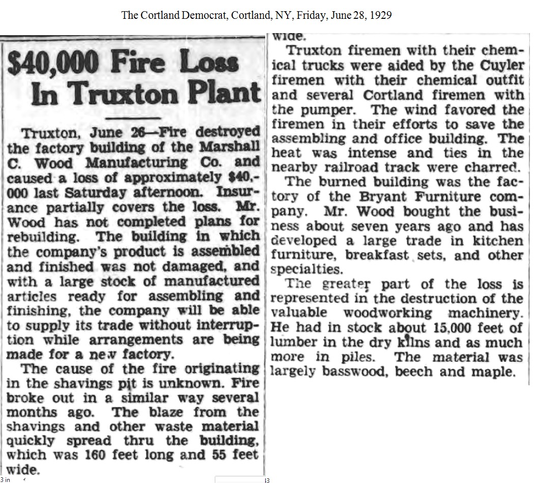 [1929-06-28] - “$40,000 Fire Loss In Truxton Plant,” The Cortland Democrat, Cortland, NY, Friday, June 28, 1929.