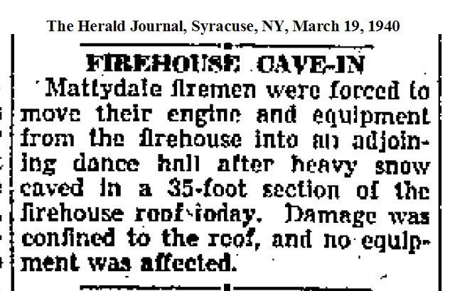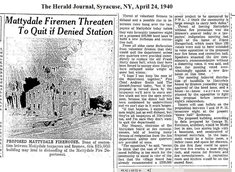 Before moving to his farm, Matty had sold off his stable of horses that were sometimes kept in the north end of the barn. Years later, in 1930, Matty invited the Volunteer Fire Department to make their home in this end of his barn. They were still occupying that end of the barn at the time of the roof collapse. After the collapse they took over the dance hall in the south end of the barn. The attorney for the Matty estate had reported that the underwriters would not insure the old barn and that its fate, in the not too distant future, was demolition. Nevertheless the fire department continued to occupy the barn while the politics of building their new home played out.