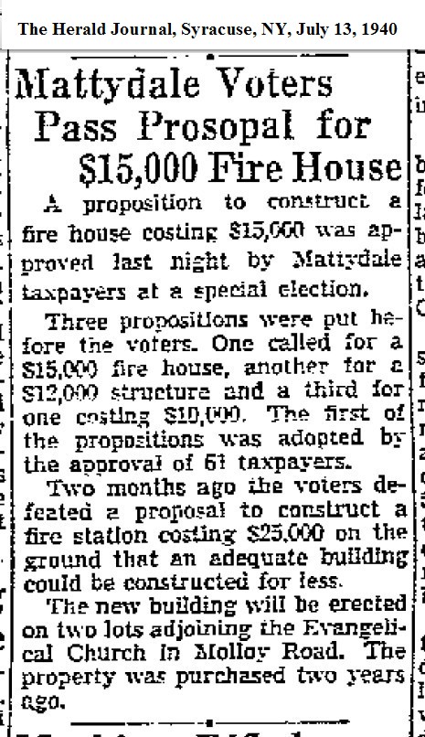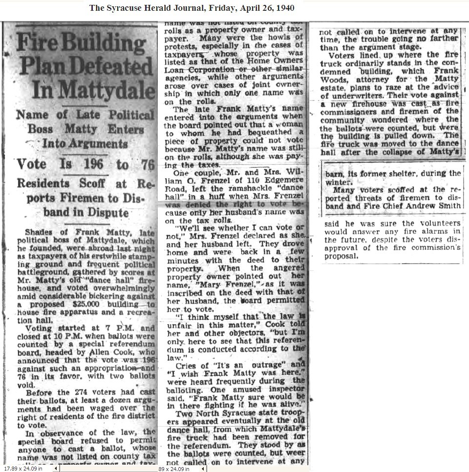 Somehow it just seems right that the vote on the firehouse referendum was held in Matty’s old Hall. Since the fire department had moved into the hall after the collapse, the equipment had to be temporarily moved out of the hall so that the voters could fit in. Following the traditions of the past there were arguments about who was eligible to vote and who was not. Two State Troopers from North Syracuse showed up, just like in the old days of Frank Matty, but their services weren’t needed on this occasion.