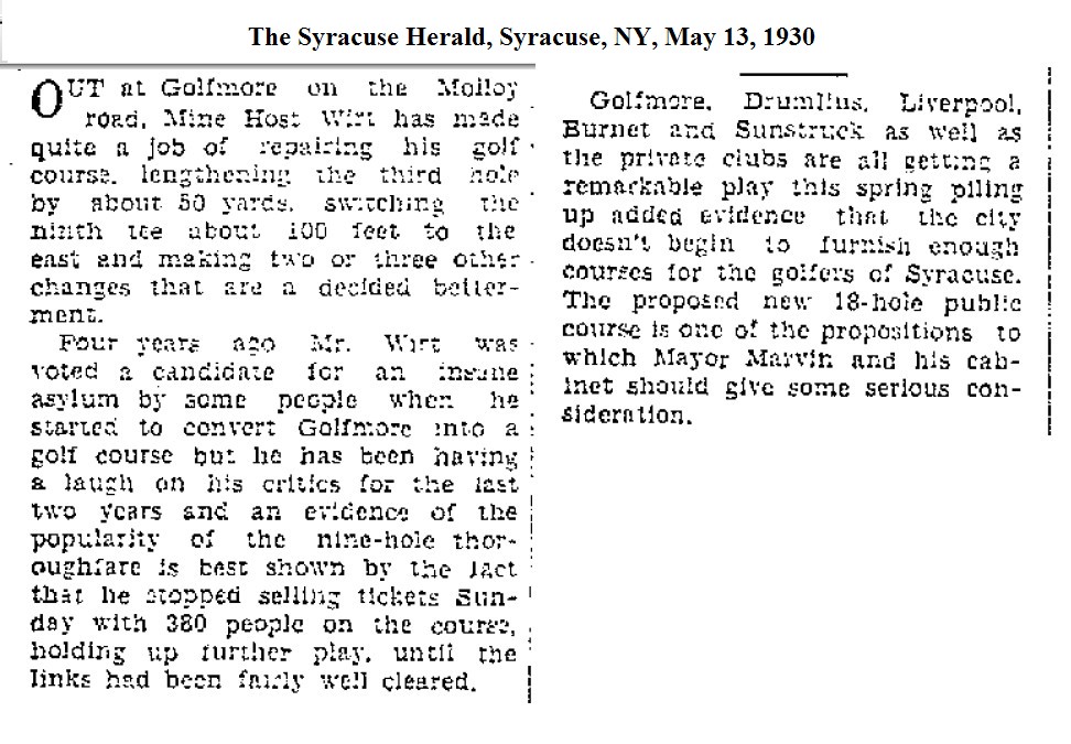 Chester E. Wirt started working on constructing the Golfmore Golf Course in 1926 and opened for business during the 1927 season. [0.5] The course was located on the southwest corner of E. Molloy Road and Townline Road. Wirt operated the course, with help from some family members, into the Depression but he was foreclosed on his mortgage in 1935. In 1942, the land was purchased by the U.S. Government, for the construction and operation of the U.S. Army Airbase during World War II. The property was given to the city after the war with the reservation that the Government could reclaim the land if the need arose. The Golfmore area was eventually reclaimed and has been used by the USMC Reserve since at least the 1960s.