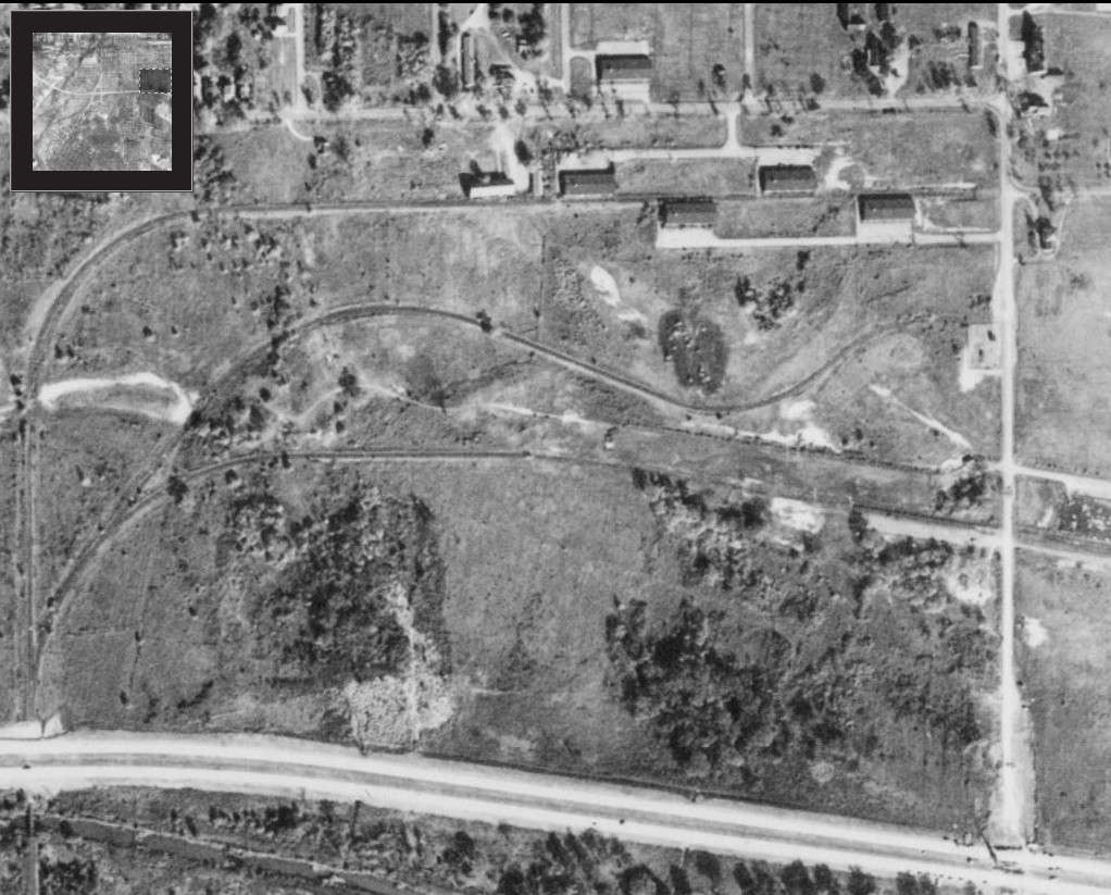 This is an aerial photo, taken on September 5, 1938, of the area where the Golfmore Course was located. East Molloy Road is running along the top of the photo and Townline Road is running north and south along the right border. The farm of the late James Malloy is located on the north side of Molloy Road about an inch west of Townline Road. The large rectangular structure just northeast of the Molloy-Townline Road intersection is the Mautz old barn. Along the east side of Townline Road the pattern of cultivated fields can be seen. All of this land was purchased by the U.S. Government in 1942 for the construction and operation of the Army Air Base. After the war some of the land was given to the city. The Malloy barn was transformed to house several families as were all the old barracks left by the Army. At the top center of the photo, on the north side of East Molloy Road, is the original Thomas Malloy that was purchased by Chester E. Wirt in 1919. Just across Molloy Road is the Golfmore Country Club. In the center of the photo, extending east and west some of the old sand traps can still be seen. Golfmore was foreclosed at the beginning of the 1935 season.