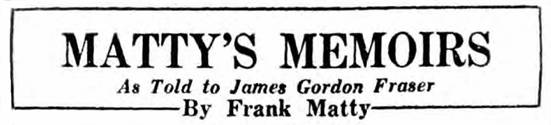These memoirs were authored by Frank Matty, as told to James Gordon Fraser. They appeared in thirty installments in the Syracuse Journal in 1933 and ran from Monday, October 30th until the thirtieth installment was published on Monday, December 4, 1933. The memoirs were untitled but I have given them titles in the table below and added a short summary or a quote or two just to convey an idea of the subject matter of each chapter. The original material is contained within quotation marks, while my comments or summaries are contained within […].