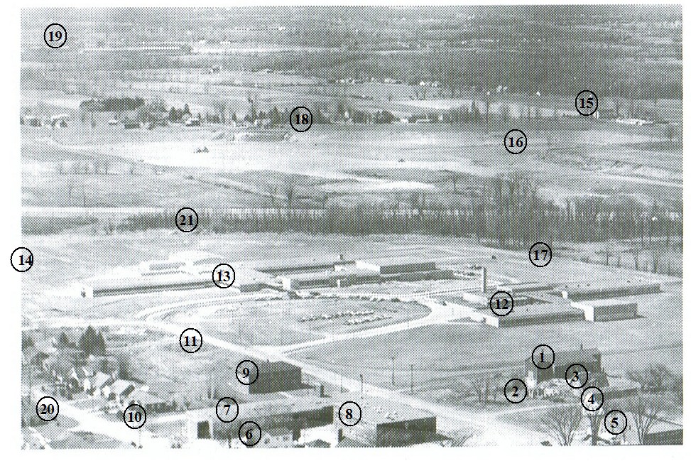 This photo is estimated to have been taken in Fall 1958 or Spring 1959. It has been reproduced from Helen Burnham's book - Trolley Stops Two, Three & Four. This is the area that was the red portion of the Kirsch Tract. The identification of the various elements in the picture have been added and described in the list below. |