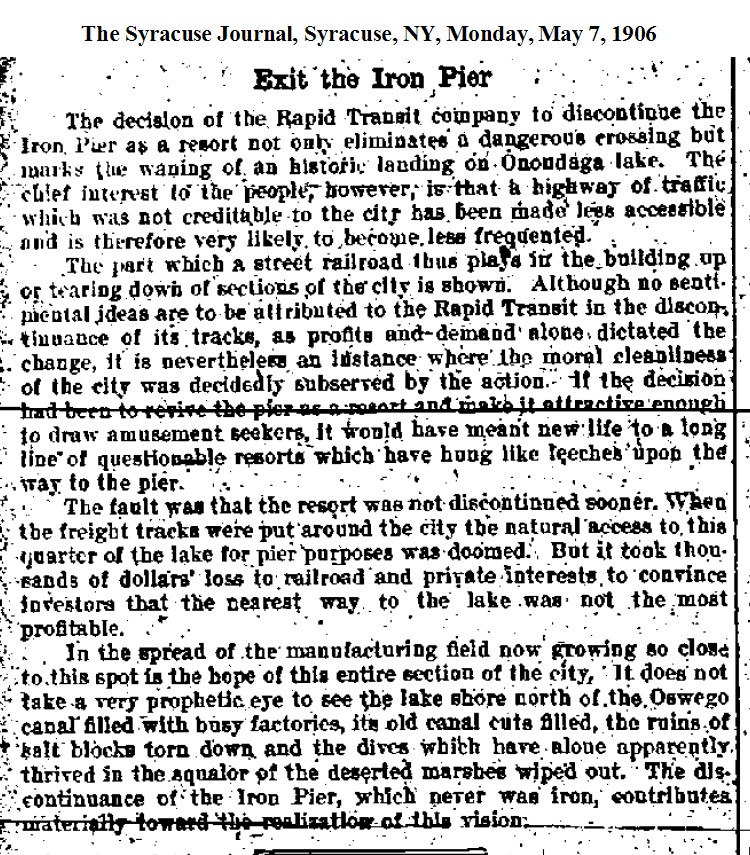 Plans and specifcations for a new pier at the lake are now open to inspection at the office of the People's Railroad Company on Wolf street in the First Ward. The new business venture is in the hands of the Iron Pier Company of Utica, who will in addition to the pier, excavate and dredge for a convenient and suitable harbor. The site selected extends from the terminus of North Salina street, southward along the Central Hudson freight track. An embankment 620 feet long by 40 feet in height will be built up to the level of Salina street from the crossing to Onondaga creek. On the embankment a pavillion 500 feet in length and 30 feet in width will be erected. It will be constructed of Georgia pine, and will be elegant architectural design. From the center of the pavillion will rise a tower, with builler(??) tows at either end of the structure. At the southern end of the pier, a breakwater will be constructed of piling and will extend 600 feet out into the lake, on one side of which a deep basin will be dredged, forming a convenient harbor for the anchorage of craft.